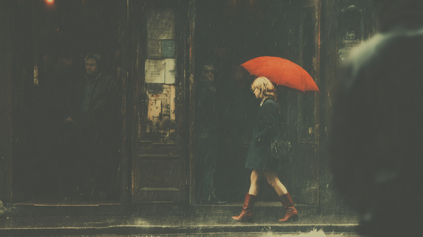 Her gaze flicked to the red umbrella in the corner. And without a thought, she stood, stepped into her boots, grabbed the umbrella, and walked out into the street.