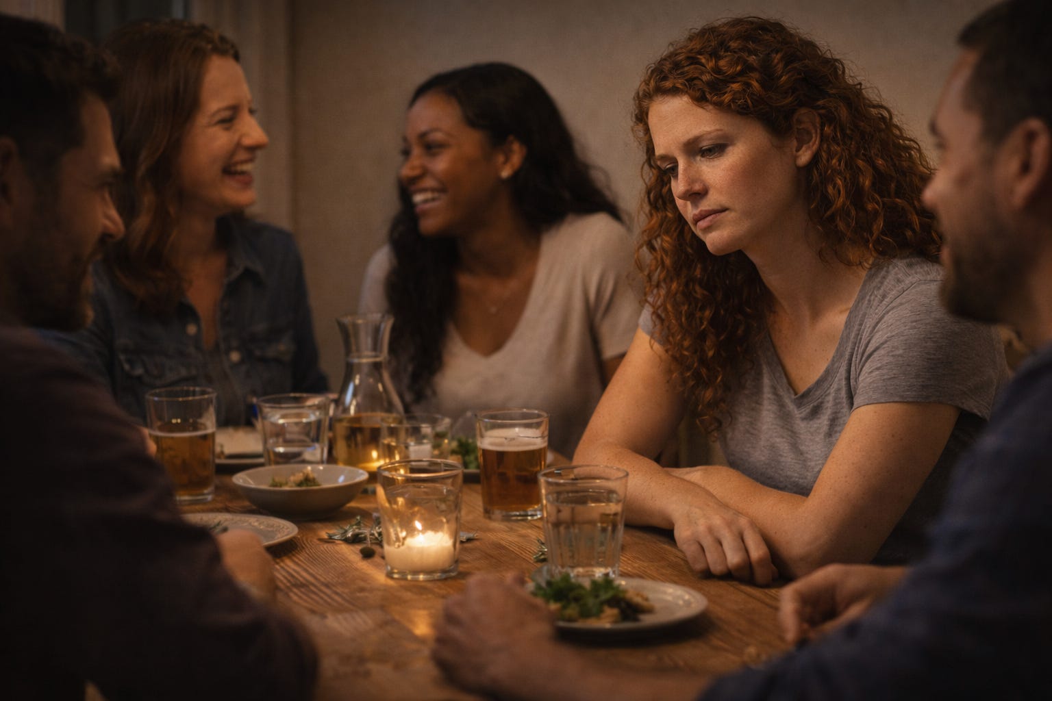 When she went back inside, nothing dramatic changed. Same people. Same noise.