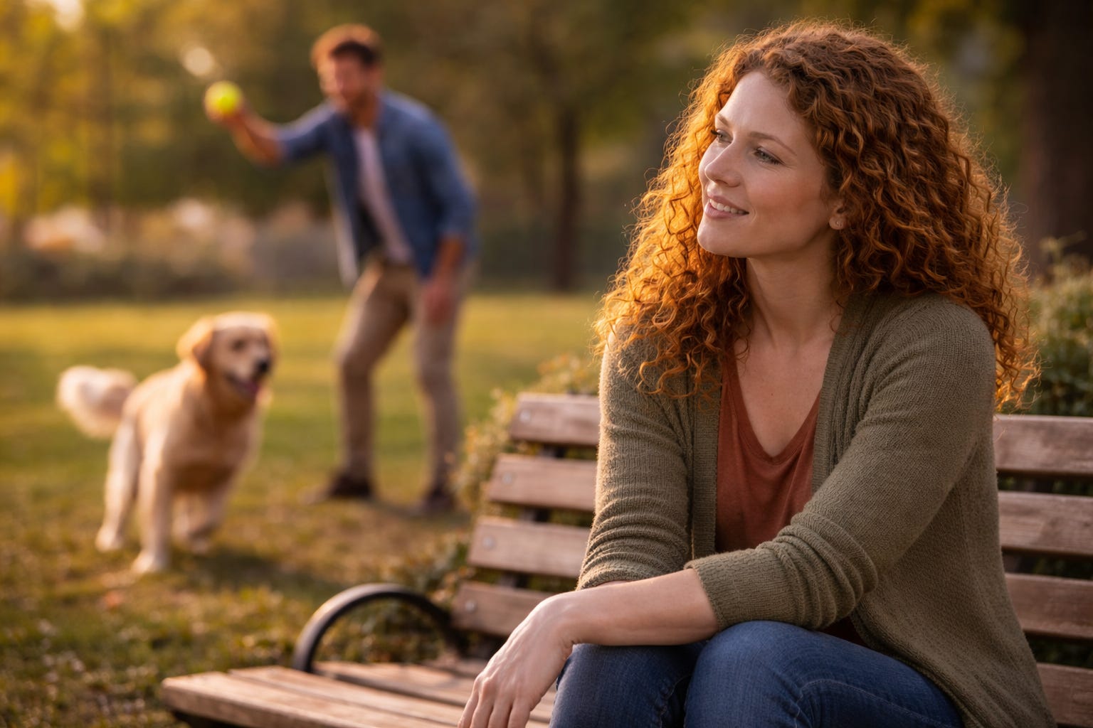 Naomi sat on the park bench watching a man throw a tennis ball for his dog.